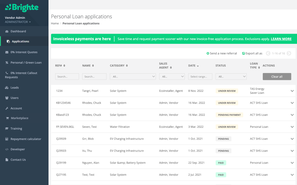This will then be submitted to the Brighte team, who will assess the application and provide the outcome of the decision to you and the customer. You can manage this via the Portal, where you can review the status of each application submitted by your customers.